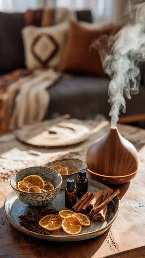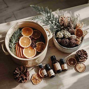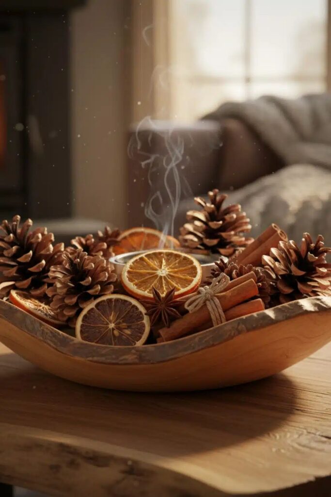 أوانٍ فخارية أو زجاجية أنيقة على الرفوف المفتوحة، تحتوي على قشور البرتقال والليمون المجففة، مع أعواد قرفة أو قرنفل. هذا التنسيق يجمع بين الجمال والوظيفة، ويضيف لمسة طبيعية غير متكلّفة.