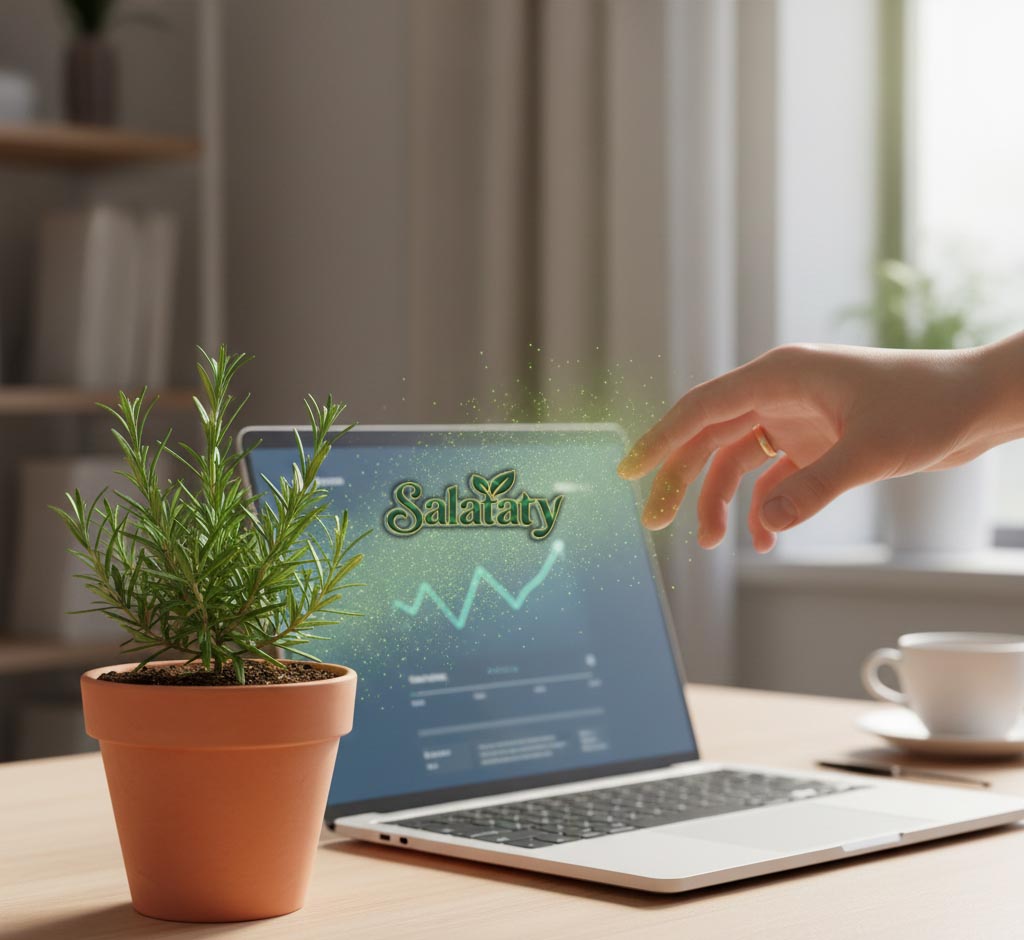 أصيص صغير من إكليل الجبل (الروزماري) بجانب الحاسوب أو على رف قريب من مساحة العمل. نبات حيّ يضيف خضرة وانتعاشاً بصريًا وعطريًا في آنٍ واحد.